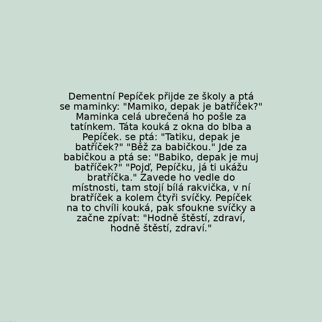 Dementní Pepíček přijde ze školy a ptá se maminky: "Mamiko, depak je batříček?" Maminka celá ubrečená ho pošle za tatínkem. Táta kouká z okna do blba a Pepíček. se ptá: "Tatiku, depak je batříček?" "Běž za babičkou." Jde za babičkou a ptá se: "Babiko, depak je muj batříček?" "Pojď, Pepíčku, já ti ukážu bratříčka." Zavede ho vedle do místnosti, tam stojí bílá rakvička, v ní bratříček a kolem čtyři svíčky. Pepíček na to chvíli kouká, pak sfoukne svíčky a začne zpívat: "Hodně štěstí, zdraví, hodně štěstí, zdraví."