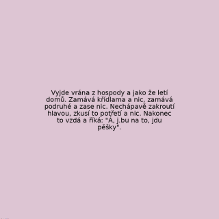Vyjde vrána z hospody a jako že letí domů. Zamává křídlama a nic, zamává podruhé a zase nic. Nechápavě zakroutí hlavou, zkusí to potřetí a nic. Nakonec to vzdá a říká: "Á, j.bu na to, jdu pěšky".