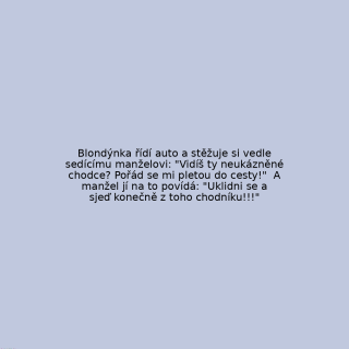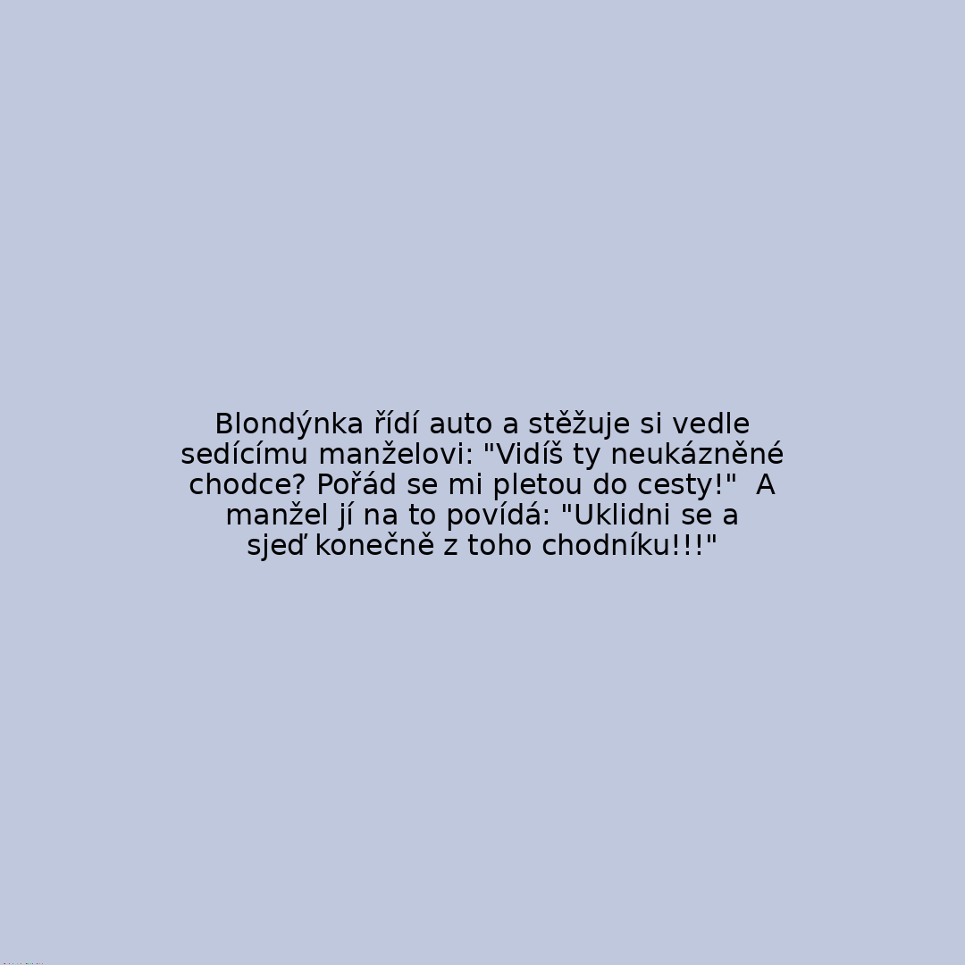 Blondýnka řídí auto a stěžuje si vedle sedícímu manželovi: "Vidíš ty neukázněné chodce? Pořád se mi pletou do cesty!" A manžel jí na to povídá: "Uklidni se a sjeď konečně z toho chodníku!!!"