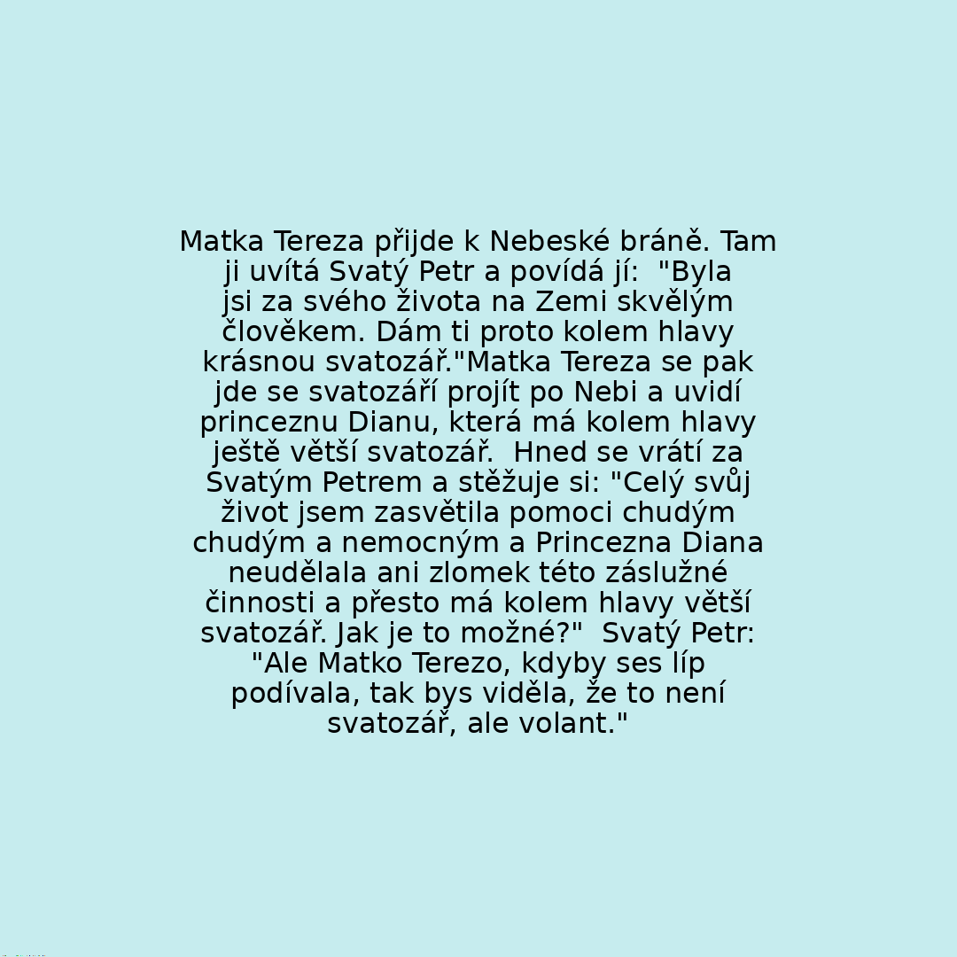 "Byla jsi za svého života na Zemi skvělým člověkem. Dám ti proto kolem hlavy krásnou svatozář."Matka Tereza se pak jde se svatozáří projít po Nebi a uvidí princeznu Dianu, která má kolem hlavy ještě větší svatozář.