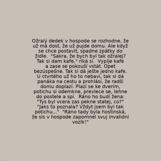 "Ráno tady byla hostinská, že sis v hospode zapomnel svuj invalidní vozík!"
