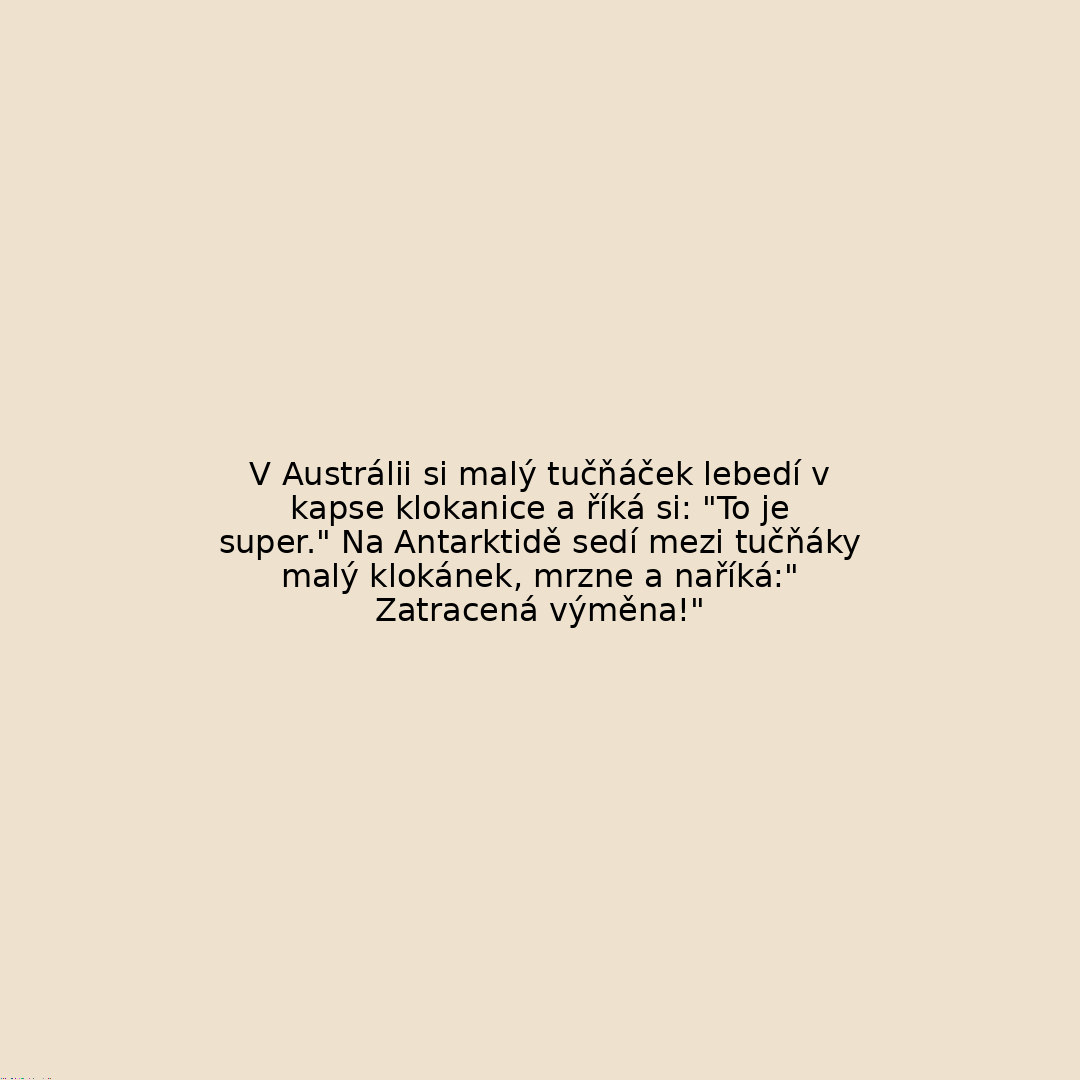 V Austrálii si malý tučňáček lebedí v kapse klokanice a říká si: "To je super." Na Antarktidě sedí mezi tučňáky malý klokánek, mrzne a naříká:" Zatracená výměna!"