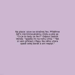 Na place: ozve se strašnej řev. Přiběhne šéf k inkriminovánému místu a ptá se: "Co je to tady za řev?" Odpoví zedník Venda: "spadla mi na nohu cihla." "Tak si vem příklad z Pepy. Na něho včera spadl celej barák a ani nepipl."