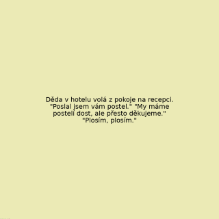 Děda v hotelu volá z pokoje na recepci. "Poslal jsem vám postel." "My máme postelí dost, ale přesto děkujeme." "Plosím, plosím."