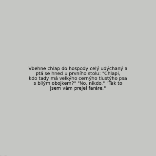 Vbehne chlap do hospody celý udýchaný a ptá se hned u prvního stolu: "Chlapi, kdo tady má velkýho cernýho tlustýho psa s bílým obojkem?" "No, nikdo." "Tak to jsem vám prejel faráre."