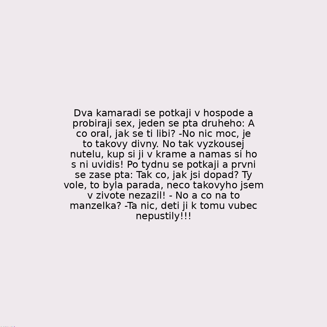 Dva kamaradi se potkaji v hospode a probiraji sex, jeden se pta druheho: A co oral, jak se ti libi? -No nic moc, je to takovy divny. No tak vyzkousej nutelu, kup si ji v krame a namas si ho s ni uvidis! Po tydnu se potkaji a prvni se zase pta: Tak co, jak jsi dopad? Ty vole, to byla parada, neco takovyho jsem v zivote nezazil! - No a co na to manzelka? -Ta nic, deti ji k tomu vubec nepustily!!!