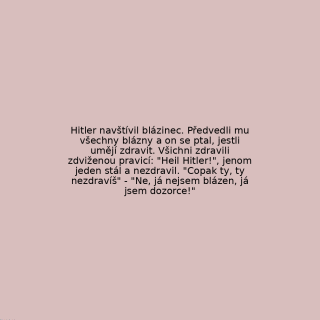 Hitler navštívil blázinec. Předvedli mu všechny blázny a on se ptal, jestli umějí zdravit. Všichni zdravili zdviženou pravicí: "Heil Hitler!", jenom jeden stál a nezdravil. "Copak ty, ty nezdravíš" - "Ne, já nejsem blázen, já jsem dozorce!"