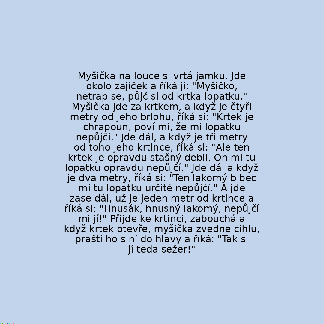 Myšička na louce si vrtá jamku. Jde okolo zajíček a říká jí: "Myšičko, netrap se, půjč si od krtka lopatku." Myšička jde za krtkem, a když je čtyři metry od jeho brlohu, říká si: "Krtek je chrapoun, poví mi, že mi lopatku nepůjčí." Jde dál, a když je tři metry od toho jeho krtince, říká si: "Ale ten krtek je opravdu stašný debil. On mi tu lopatku opravdu nepůjčí." Jde dál a když je dva metry, říká si: "Ten lakomý blbec mi tu lopatku určitě nepůjčí." A jde zase dál, už je jeden metr od krtince a říká si: "Hnusák, hnusný lakomý, nepůjčí mi jí!" Přijde ke krtinci, zabouchá a když krtek otevře, myšička zvedne cihlu, praští ho s ní do hlavy a říká: "Tak si jí teda sežer!"