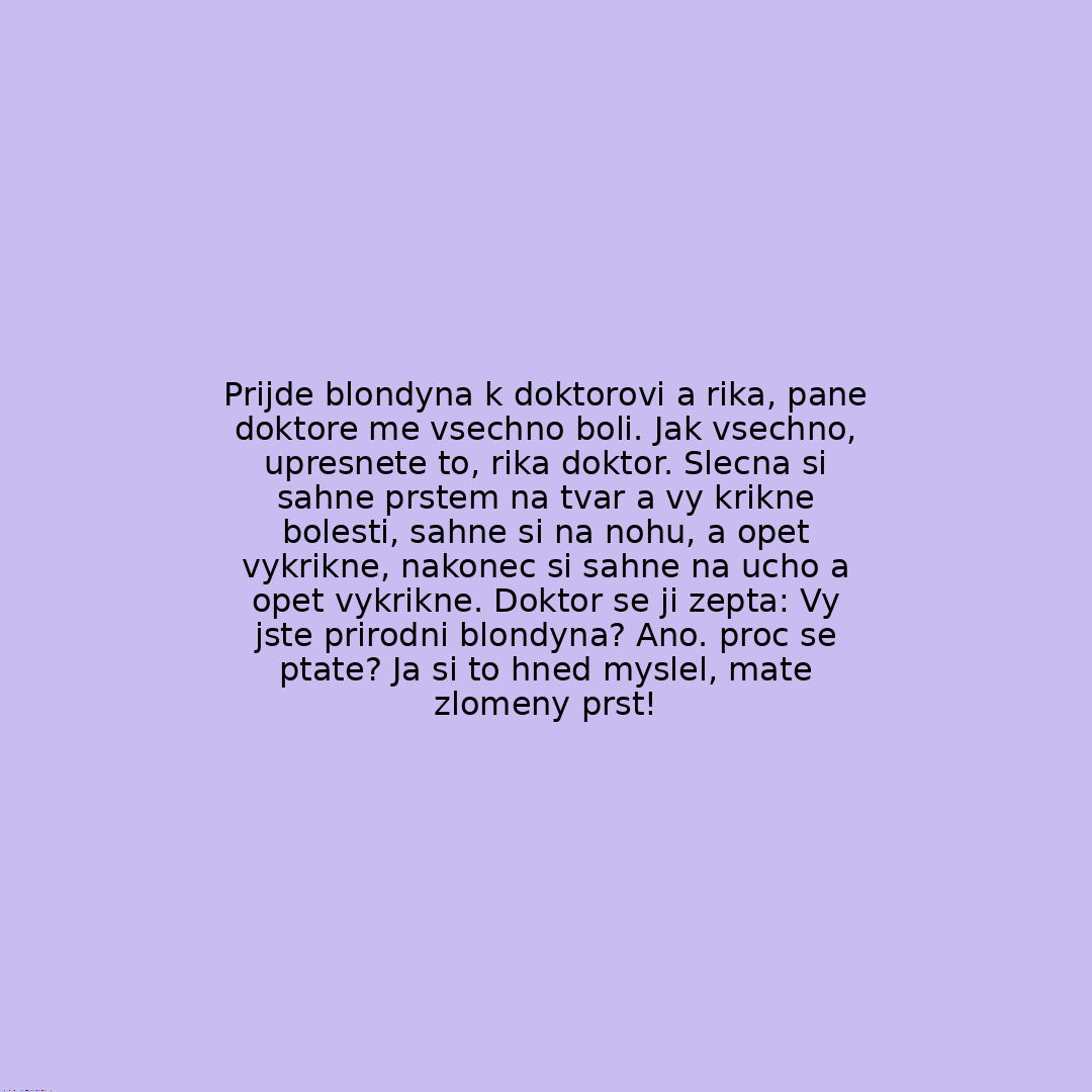 Prijde blondyna k doktorovi a rika, pane doktore me vsechno boli. Jak vsechno, upresnete to, rika doktor. Slecna si sahne prstem na tvar a vy krikne bolesti, sahne si na nohu, a opet vykrikne, nakonec si sahne na ucho a opet vykrikne. Doktor se ji zepta: Vy jste prirodni blondyna? Ano. proc se ptate? Ja si to hned myslel, mate zlomeny prst!