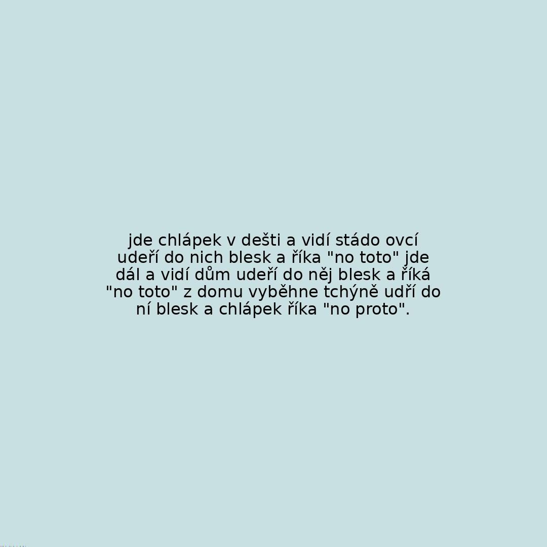 jde chlápek v dešti a vidí stádo ovcí udeří do nich blesk a říka "no toto" jde dál a vidí dům udeří do něj blesk a říká "no toto" z domu vyběhne tchýně udří do ní blesk a chlápek říka "no proto".