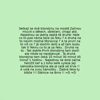 Setkají se dvě blondýny na mostě.Začnou mluvit o dětech, oblečení, chlapi atd. Najednou se jedna zeptá té druhé: Hele co to pod náma teče za řeku ? A druhá na to nevím možná Moravice ? A ta první na to víš co ? Já skočím dolů a až tam budu tak ti řeknu co to je za řeku . Druhá na to : Tak dobře.Prvni blondýna tam skočí ale nikde se neobjevuje . Ta druhá blondýna tam čeká 10 minut 30 minut 45 minut 1 hodinu . Najednou se dole začne hemžit keř a z toho keře vyleze její kámoška blondýna ale je celá od krve !! A volá na svou kámošku : Žádná řeka ty blbče !!! Dálnice na Brno !! =D =D