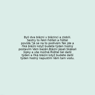 Byli dva blázni v blázinci a zlobili. Sestry to řekli řiditeli a řiditel povídá."Já se na to podívám.Tak jde a říká blázni když budete týden hodný postavím Vám bazén.Blázni jásali.Skákali šipky a vše možné.Řiditel šel další týden a říká blázni když budete další týden hodný napustím Vám tam vodu.