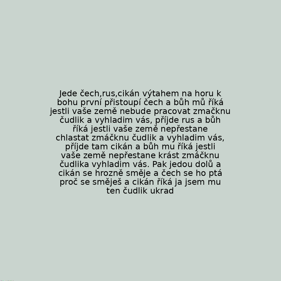 Jede čech,rus,cikán výtahem na horu k bohu první přistoupí čech a bůh mů říká jestli vaše země nebude pracovat zmačknu čudlik a vyhladim vás, příjde rus a bůh říká jestli vaše země nepřestane chlastat zmáčknu čudlik a vyhladim vás, příjde tam cikán a bůh mu říká jestli vaše země nepřestane krást zmáčknu čudlika vyhladim vás. Pak jedou dolů a cikán se hrozně směje a čech se ho ptá proč se směješ a cikán říká ja jsem mu ten čudlik ukrad