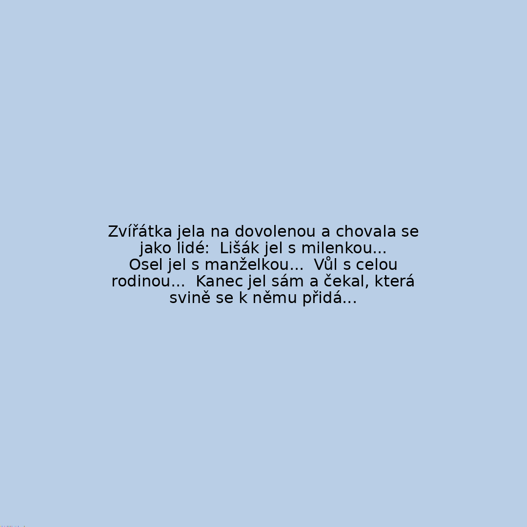 Zvířátka jela na dovolenou a chovala se jako lidé: Lišák jel s milenkou... Osel jel s manželkou... Vůl s celou rodinou... Kanec jel sám a čekal, která svině se k němu přidá...