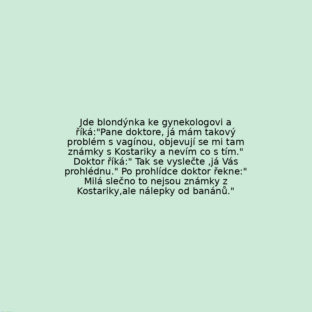 Jde blondýnka ke gynekologovi a říká:"Pane doktore, já mám takový problém s vagínou, objevují se mi tam známky s Kostariky a nevím co s tím." Doktor říká:" Tak se vyslečte ,já Vás prohlédnu." Po prohlídce doktor řekne:" Milá slečno to nejsou známky z Kostariky,ale nálepky od banánů."