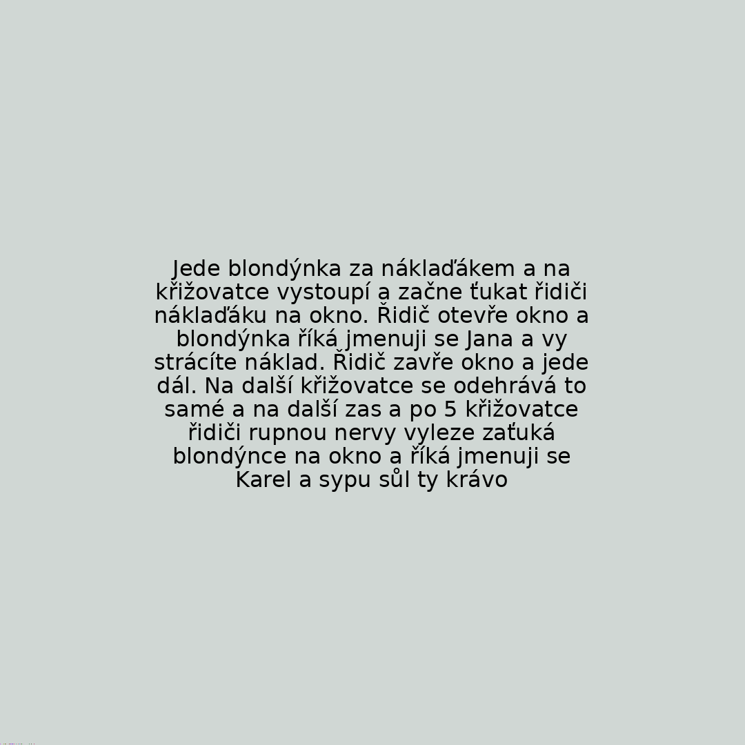 Jede blondýnka za náklaďákem a na křižovatce vystoupí a začne ťukat řidiči náklaďáku na okno. Řidič otevře okno a blondýnka říká jmenuji se Jana a vy strácíte náklad. Řidič zavře okno a jede dál. Na další křižovatce se odehrává to samé a na další zas a po 5 křižovatce řidiči rupnou nervy vyleze zaťuká blondýnce na okno a říká jmenuji se Karel a sypu sůl ty krávo