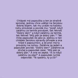 Chlápek má papouška a ten je strašně sprostej. Jednou chce udělat na ženskou dobrej dojem, tak mu uváže na každou nohu provázek a povídá mu: "Jozef, když zatáhnu za tenhle provázek, tak řekneš "Dobrý den!" a když zatáhnu za tenhle, tak řekneš "Můj pán je dobrý pán."" Tak milej papoušek že jako jo. Jednou si ten chlápek ženskou opravdu přivede a ona hned k papouchovi, a že proč má ty provázky na nohou. Zatáhne za jeden a papoušek povídá: "Dobrý den!" Zatáhne za druhej a papoušek zase: "Můj pán je dobrý pán." A ona se zeptá: "A co když zatáhnu za oba?" A papoušek rychle odpovídá: "To spadnu, ty p.čo!"
