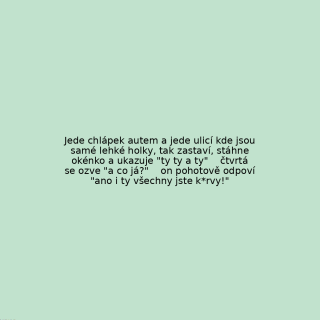 Jede chlápek autem a jede ulicí kde jsou samé lehké holky, tak zastaví, stáhne okénko a ukazuje "ty ty a ty" čtvrtá se ozve "a co já?" on pohotově odpoví "ano i ty všechny jste k*rvy!"