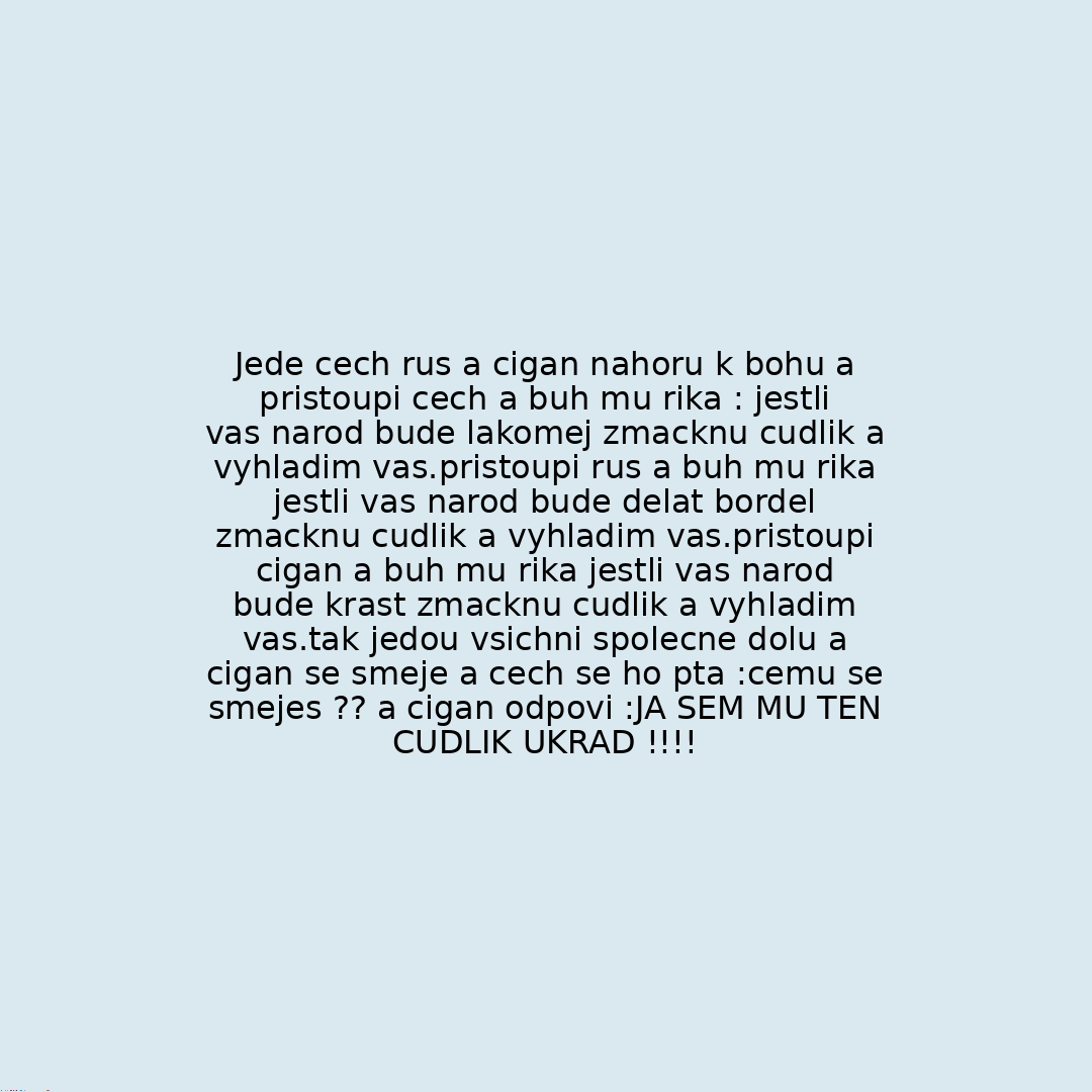 Jede cech rus a cigan nahoru k bohu a pristoupi cech a buh mu rika : jestli vas narod bude lakomej zmacknu cudlik a vyhladim vas.pristoupi rus a buh mu rika jestli vas narod bude delat bordel zmacknu cudlik a vyhladim vas.pristoupi cigan a buh mu rika jestli vas narod bude krast zmacknu cudlik a vyhladim vas.tak jedou vsichni spolecne dolu a cigan se smeje a cech se ho pta :cemu se smejes ?? a cigan odpovi :JA SEM MU TEN CUDLIK UKRAD !!!!