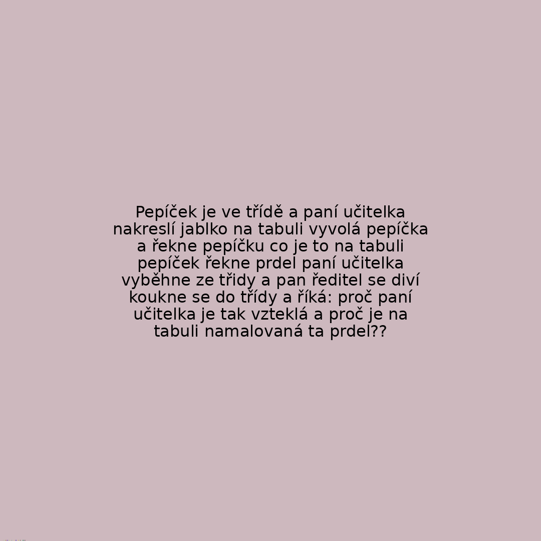 Pepíček je ve třídě a paní učitelka nakreslí jablko na tabuli vyvolá pepíčka a řekne pepíčku co je to na tabuli pepíček řekne prdel paní učitelka vyběhne ze třidy a pan ředitel se diví koukne se do třídy a říká: proč paní učitelka je tak vzteklá a proč je na tabuli namalovaná ta prdel??