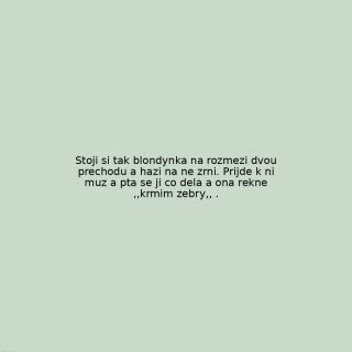 Stoji si tak blondynka na rozmezi dvou prechodu a hazi na ne zrni. Prijde k ni muz a pta se ji co dela a ona rekne ,,krmim zebry,, .