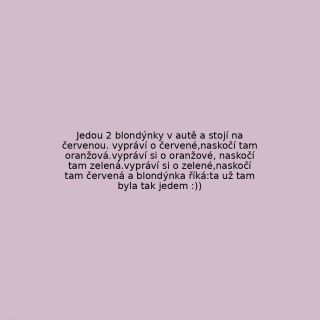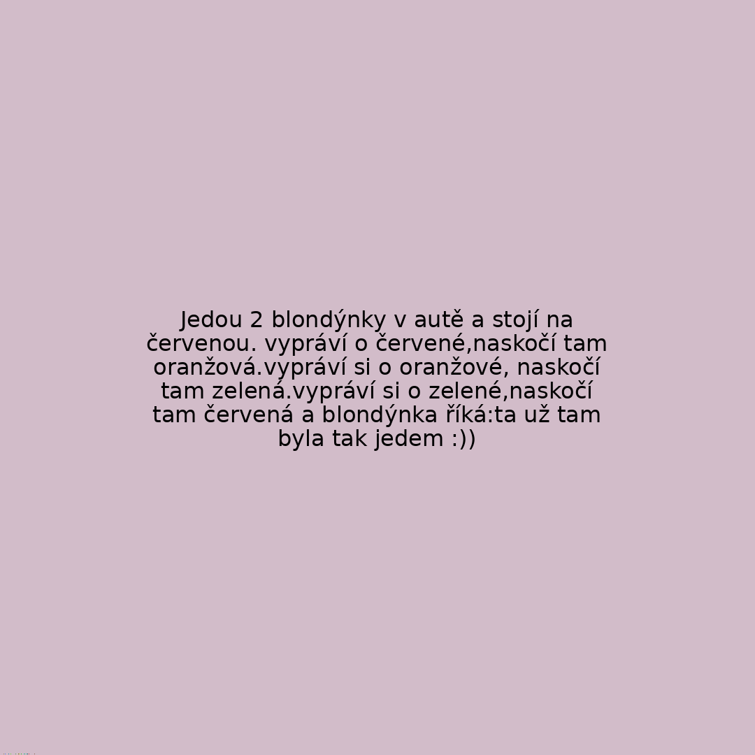 Jedou 2 blondýnky v autě a stojí na červenou. vypráví o červené,naskočí tam oranžová.vypráví si o oranžové, naskočí tam zelená.vypráví si o zelené,naskočí tam červená a blondýnka říká:ta už tam byla tak jedem :))