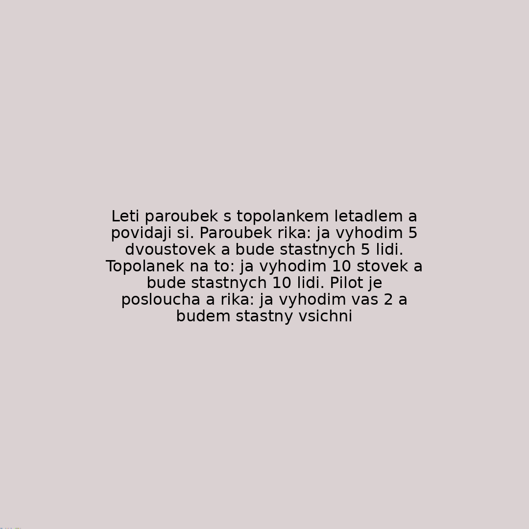 Leti paroubek s topolankem letadlem a povidaji si. Paroubek rika: ja vyhodim 5 dvoustovek a bude stastnych 5 lidi. Topolanek na to: ja vyhodim 10 stovek a bude stastnych 10 lidi. Pilot je posloucha a rika: ja vyhodim vas 2 a budem stastny vsichni