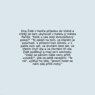 Dva Židé z Haliče přijedou do Vídně a chtějí se tam ubytovat v hotelu U města Paříže. "Kolik u vás stojí dvoulůžkový pokoj?" "To záleží na tom, ve kterém je poschodí. V přízemí tisíc šilinků, v 1. patře osm set, ve druhém šest set, ve třetím čtyři sta a ve čtvrtém tři sta. Židé poděkují a mají se k odchodu. "Zdají se pánům náše ceny příliš vysoké?", ptá se ještě recepční. "To ne", ujišťují ho oba, "Jenom hotel se nám zdá příliš nízký."