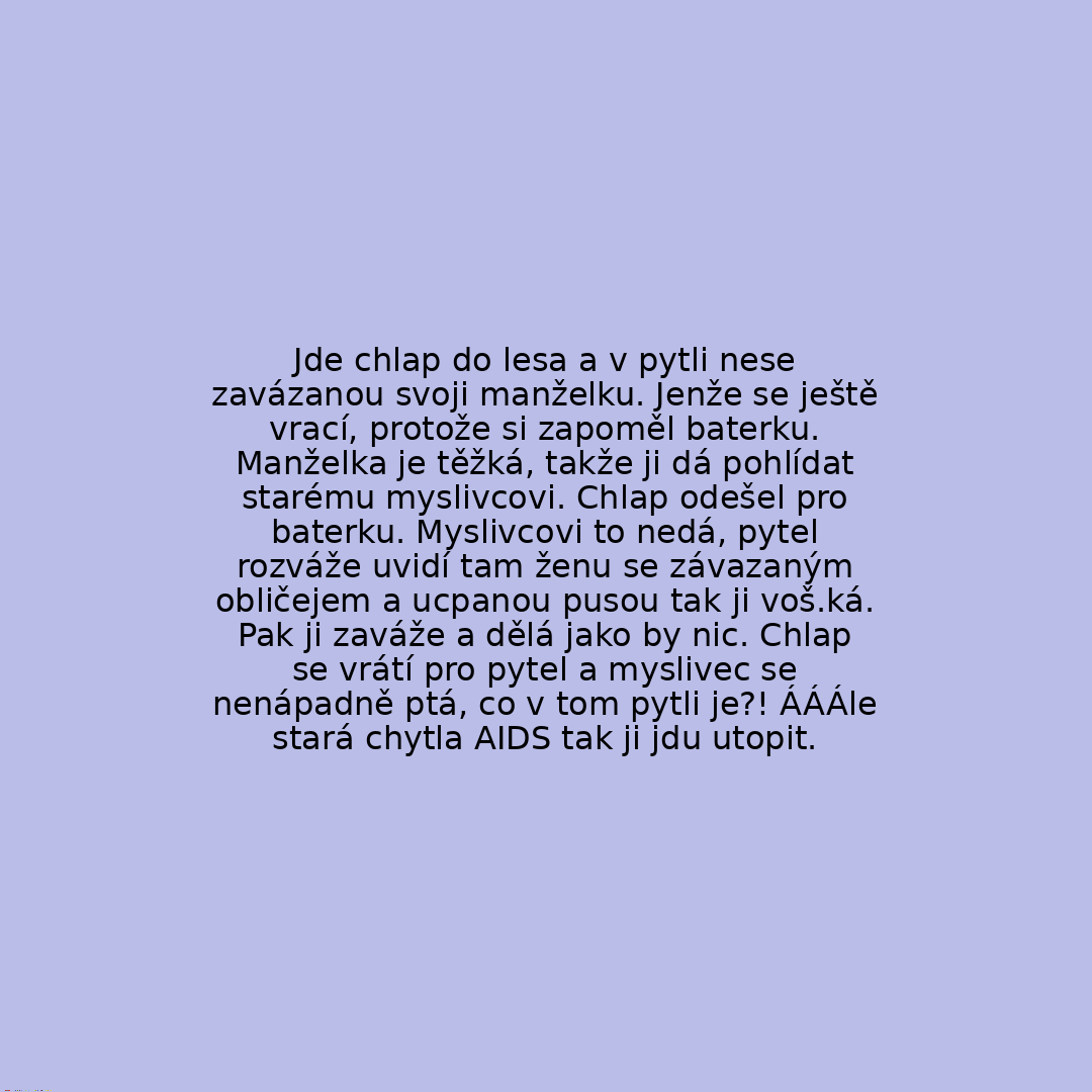 Jde chlap do lesa a v pytli nese zavázanou svoji manželku. Jenže se ještě vrací, protože si zapoměl baterku. Manželka je těžká, takže ji dá pohlídat starému myslivcovi. Chlap odešel pro baterku. Myslivcovi to nedá, pytel rozváže uvidí tam ženu se závazaným obličejem a ucpanou pusou tak ji voš.ká. Pak ji zaváže a dělá jako by nic. Chlap se vrátí pro pytel a myslivec se nenápadně ptá, co v tom pytli je?! ÁÁÁle stará chytla AIDS tak ji jdu utopit.