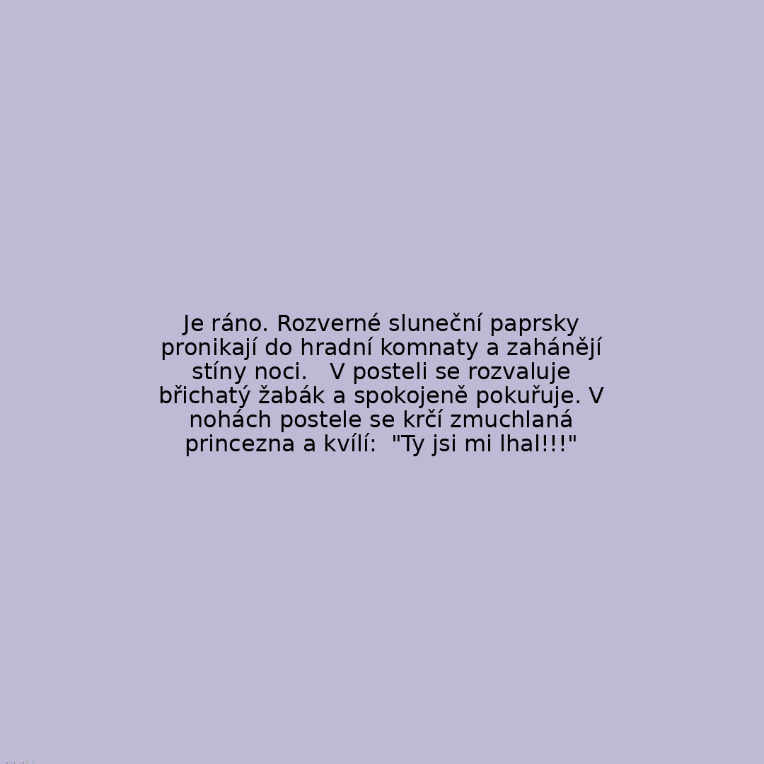 Je ráno. Rozverné sluneční paprsky pronikají do hradní komnaty a zahánějí stíny noci. V posteli se rozvaluje břichatý žabák a spokojeně pokuřuje. V nohách postele se krčí zmuchlaná princezna a kvílí: "Ty jsi mi lhal!!!"