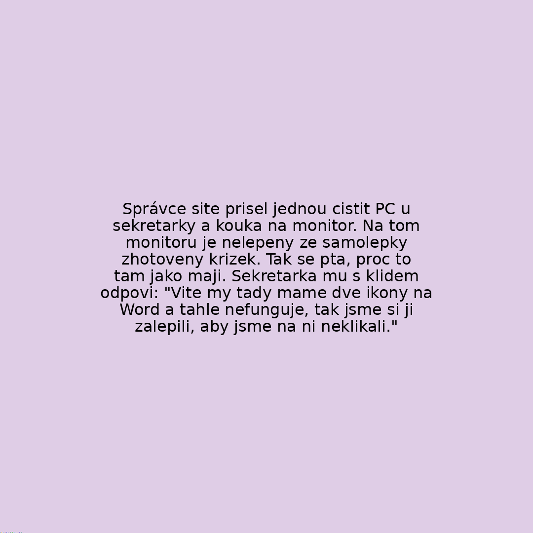 Správce site prisel jednou cistit PC u sekretarky a kouka na monitor. Na tom monitoru je nelepeny ze samolepky zhotoveny krizek. Tak se pta, proc to tam jako maji. Sekretarka mu s klidem odpovi: "Vite my tady mame dve ikony na Word a tahle nefunguje, tak jsme si ji zalepili, aby jsme na ni neklikali."