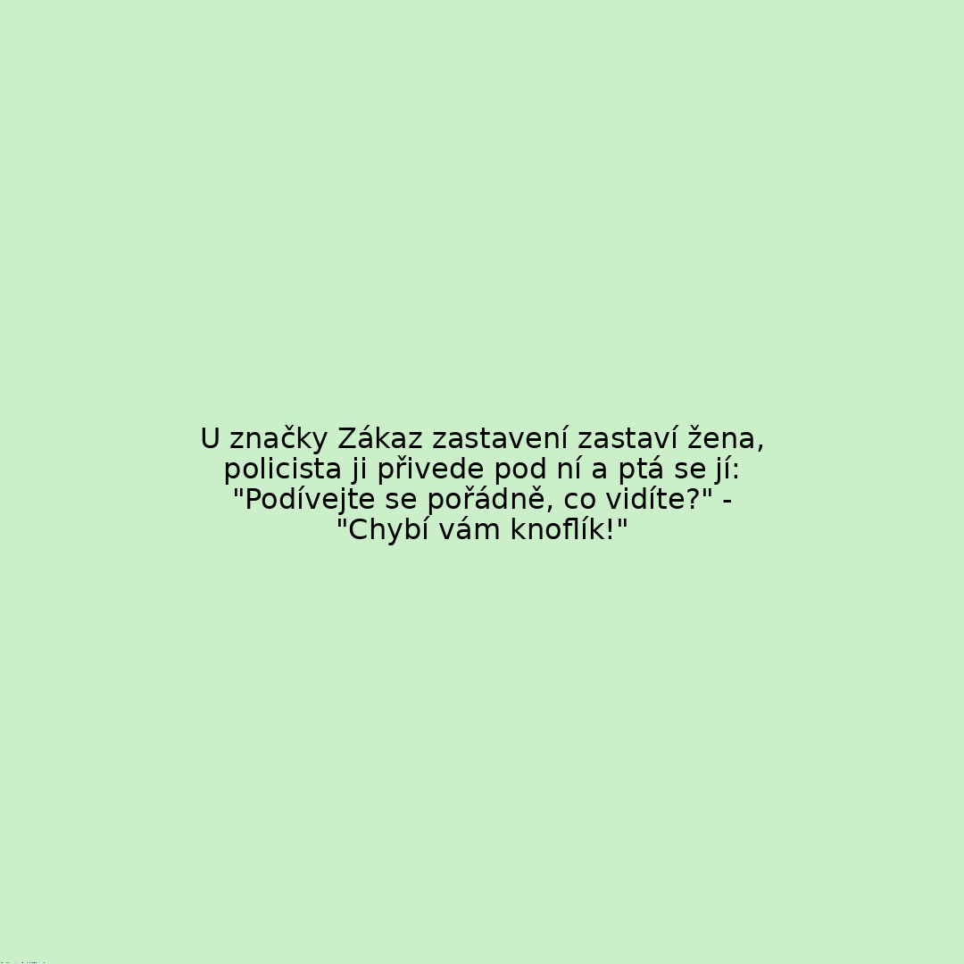 U značky Zákaz zastavení zastaví žena, policista ji přivede pod ní a ptá se jí: "Podívejte se pořádně, co vidíte?" - "Chybí vám knoflík!"