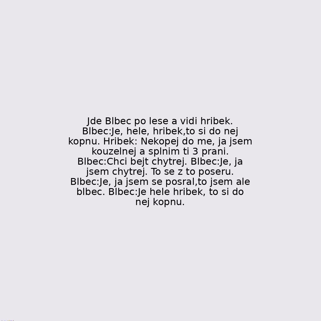 Jde Blbec po lese a vidi hribek. Blbec:Je, hele, hribek,to si do nej kopnu. Hribek: Nekopej do me, ja jsem kouzelnej a splnim ti 3 prani. Blbec:Chci bejt chytrej. Blbec:Je, ja jsem chytrej. To se z to poseru. Blbec:Je, ja jsem se posral,to jsem ale blbec. Blbec:Je hele hribek, to si do nej kopnu.