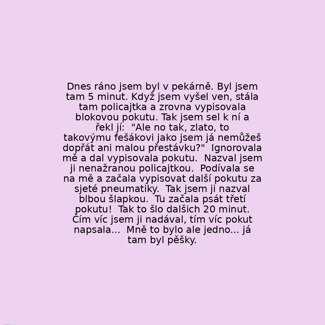 Dnes ráno jsem byl v pekárně. Byl jsem tam 5 minut. Když jsem vyšel ven, stála tam policajtka a zrovna vypisovala blokovou pokutu. Tak jsem sel k ní a řekl jí: