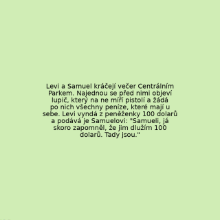 Levi a Samuel kráčejí večer Centrálním Parkem. Najednou se před nimi objeví lupič, který na ne míří pistolí a žádá po nich všechny peníze, které mají u sebe. Levi vyndá z peněženky 100 dolarů a podává je Samuelovi: "Samueli, já skoro zapomněl, že jim dlužím 100 dolarů. Tady jsou."