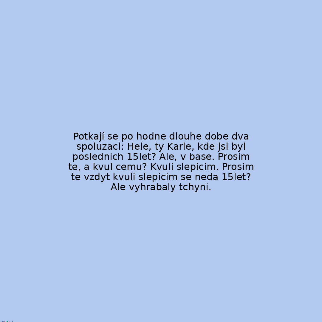 Potkají se po hodne dlouhe dobe dva spoluzaci: Hele, ty Karle, kde jsi byl poslednich 15let? Ale, v base. Prosim te, a kvul cemu? Kvuli slepicim. Prosim te vzdyt kvuli slepicim se neda 15let? Ale vyhrabaly tchyni.