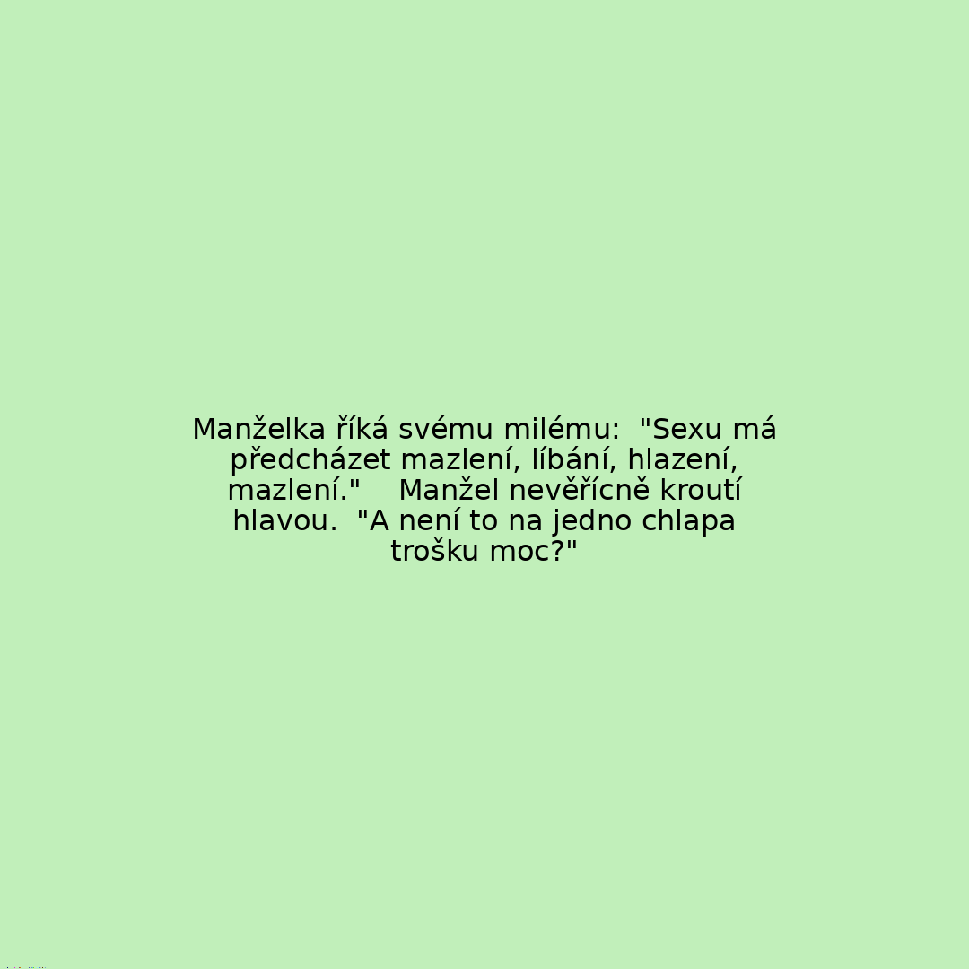 Manželka říká svému milému: "Sexu má předcházet mazlení, líbání, hlazení, mazlení." Manžel nevěřícně kroutí hlavou. "A není to na jedno chlapa trošku moc?"