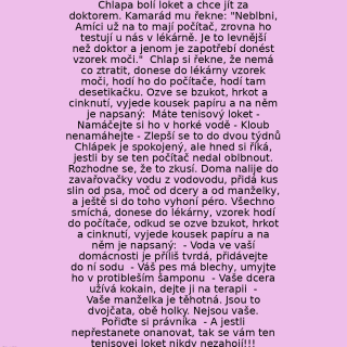 Chlapa bolí loket a chce jít za doktorem. Kamarád mu řekne: "Neblbni, Amíci už na to mají počítač, zrovna ho testují u nás v lékárně. Je to levnější než doktor a jenom je zapotřebí donést vzorek moči."