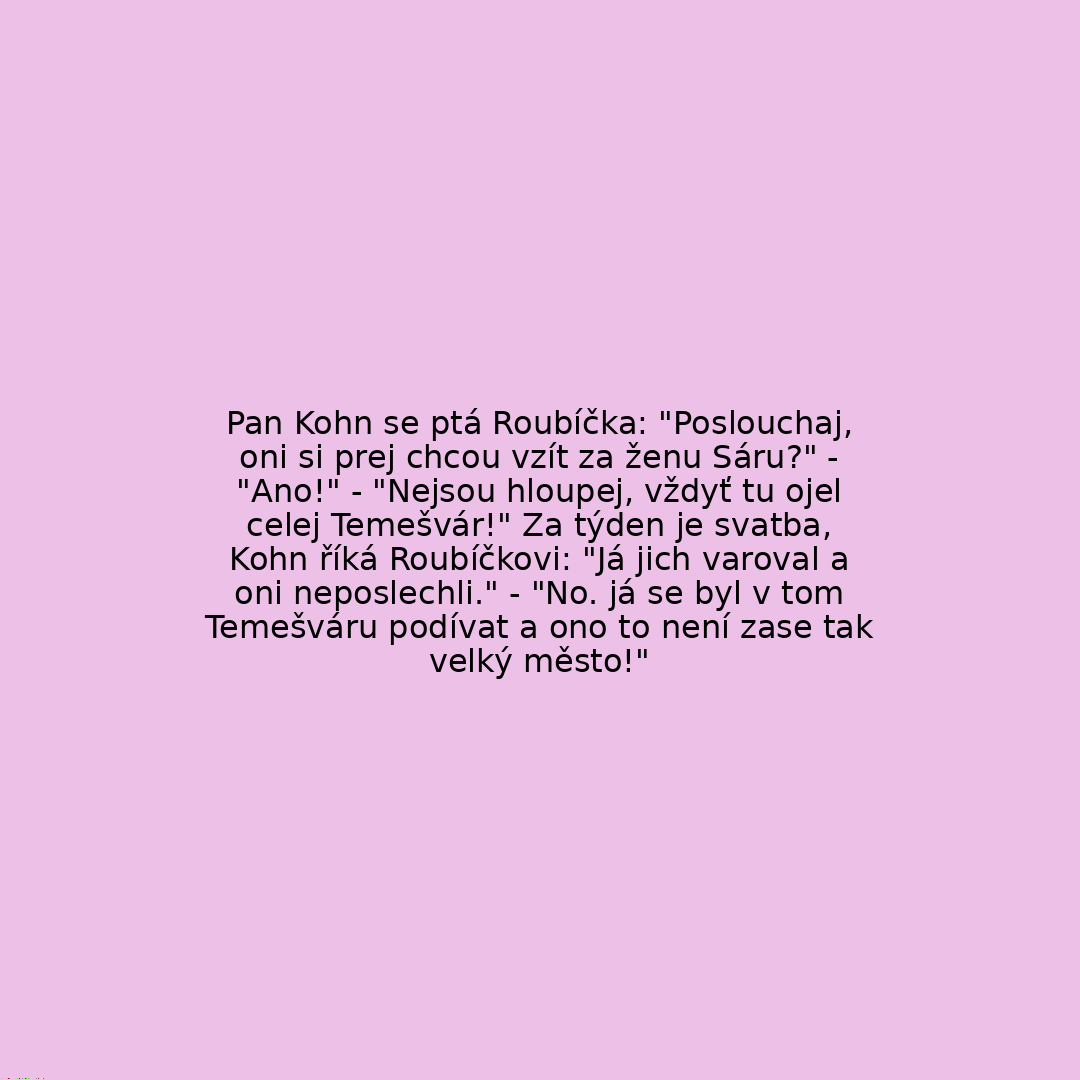 Pan Kohn se ptá Roubíčka: "Poslouchaj, oni si prej chcou vzít za ženu Sáru?" - "Ano!" - "Nejsou hloupej, vždyť tu ojel celej Temešvár!" Za týden je svatba, Kohn říká Roubíčkovi: "Já jich varoval a oni neposlechli." - "No. já se byl v tom Temešváru podívat a ono to není zase tak velký město!"