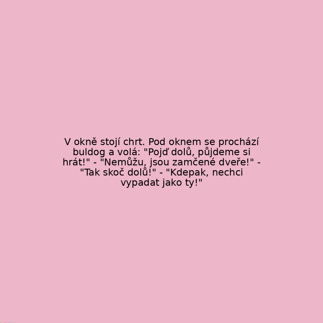V okně stojí chrt. Pod oknem se prochází buldog a volá: "Pojď dolů, půjdeme si hrát!" - "Nemůžu, jsou zamčené dveře!" - "Tak skoč dolů!" - "Kdepak, nechci vypadat jako ty!"