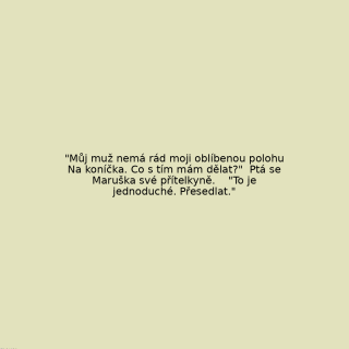 "Můj muž nemá rád moji oblíbenou polohu Na koníčka. Co s tím mám dělat?" Ptá se Maruška své přítelkyně. "To je jednoduché. Přesedlat."