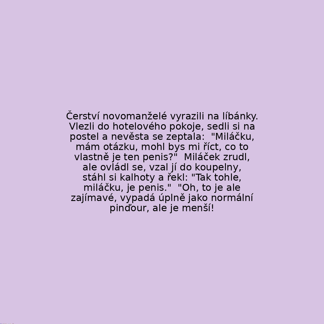 Čerství novomanželé vyrazili na líbánky. Vlezli do hotelového pokoje, sedli si na postel a nevěsta se zeptala: