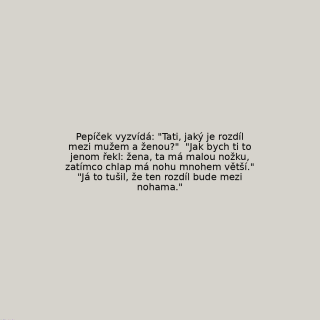 Pepíček vyzvídá: "Tati, jaký je rozdíl mezi mužem a ženou?" "Jak bych ti to jenom řekl: žena, ta má malou nožku, zatímco chlap má nohu mnohem větší." "Já to tušil, že ten rozdíl bude mezi nohama."