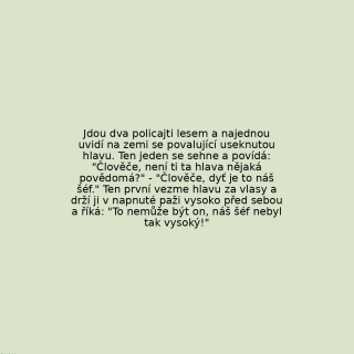 Jdou dva policajti lesem a najednou uvidí na zemi se povalující useknutou hlavu. Ten jeden se sehne a povídá: "Člověče, není ti ta hlava nějaká povědomá?" - "Člověče, dyť je to náš šéf." Ten první vezme hlavu za vlasy a drží ji v napnuté paži vysoko před sebou a říká: "To nemůže být on, náš šéf nebyl tak vysoký!"
