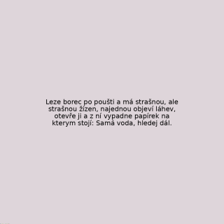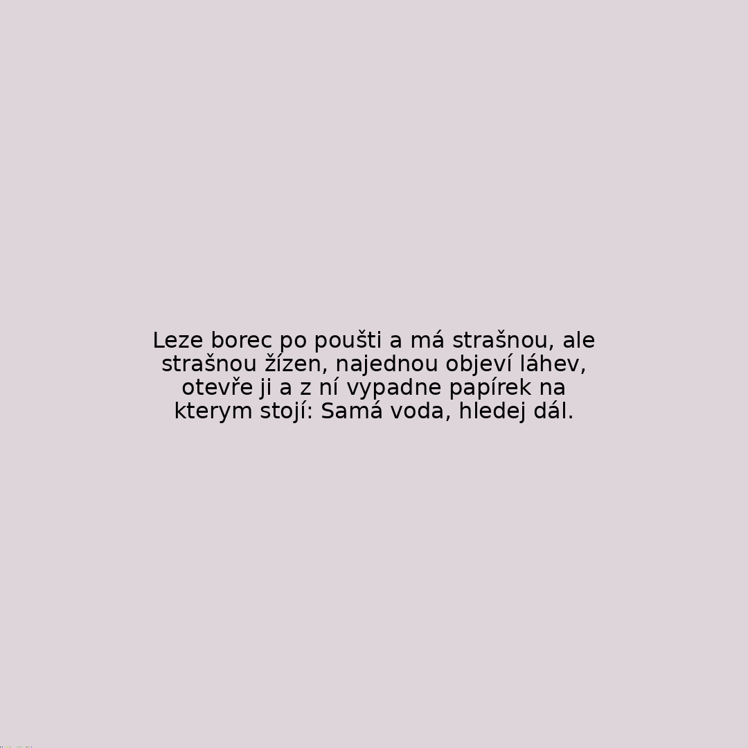 Leze borec po poušti a má strašnou, ale strašnou žízen, najednou objeví láhev, otevře ji a z ní vypadne papírek na kterym stojí: Samá voda, hledej dál.