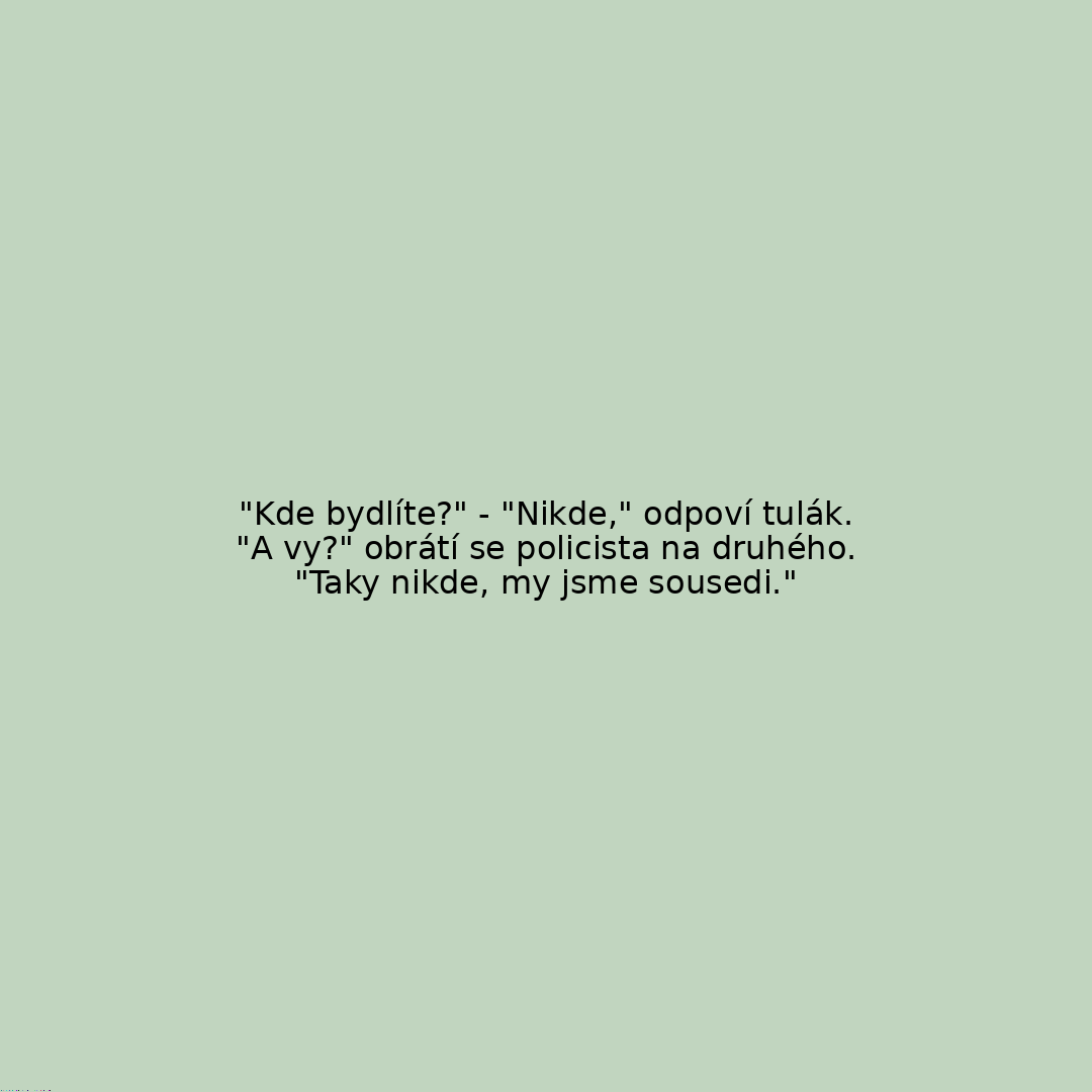"Kde bydlíte?" - "Nikde," odpoví tulák. "A vy?" obrátí se policista na druhého. "Taky nikde, my jsme sousedi."