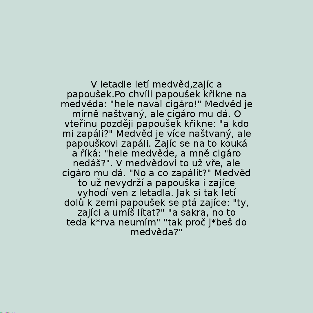 V letadle letí medvěd,zajíc a papoušek.Po chvíli papoušek křikne na medvěda: "hele naval cigáro!" Medvěd je mírně naštvaný, ale cigáro mu dá. O vteřinu později papoušek křikne: "a kdo mi zapáli?" Medvěd je více naštvaný, ale papouškovi zapáli. Zajíc se na to kouká a říká: "hele medvěde, a mně cigáro nedáš?". V medvědovi to už vře, ale cigáro mu dá. "No a co zapálit?" Medvěd to už nevydrží a papouška i zajíce vyhodí ven z letadla. Jak si tak letí dolů k zemi papoušek se ptá zajíce: "ty, zajíci a umíš lítat?" "a sakra, no to teda k*rva neumím" "tak proč j*beš do medvěda?"