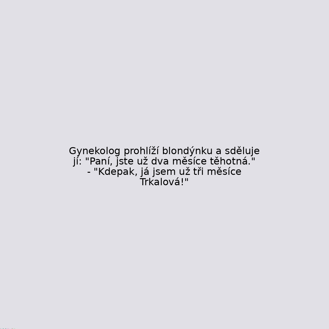 Gynekolog prohlíží blondýnku a sděluje jí: "Paní, jste už dva měsíce těhotná." - "Kdepak, já jsem už tři měsíce Trkalová!"