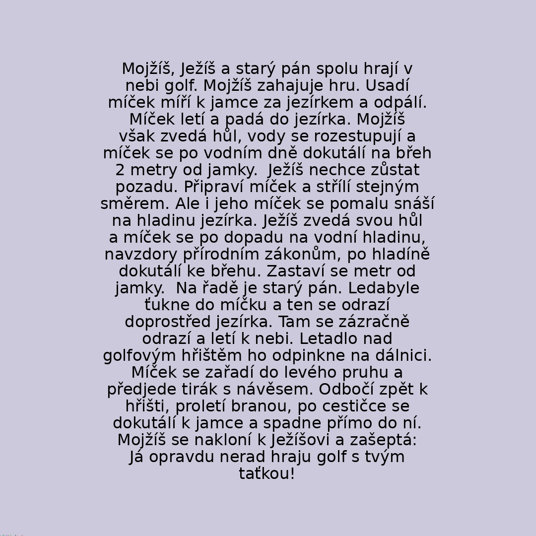 Mojžíš, Ježíš a starý pán spolu hrají v nebi golf. Mojžíš zahajuje hru. Usadí míček míří k jamce za jezírkem a odpálí. Míček letí a padá do jezírka. Mojžíš však zvedá hůl, vody se rozestupují a míček se po vodním dně dokutálí na břeh 2 metry od jamky.