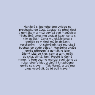 Manželé si jednoho dne vyjdou na procházku do ZOO. Zastaví se před klecí s gorilákem a muž povídá své manželce: